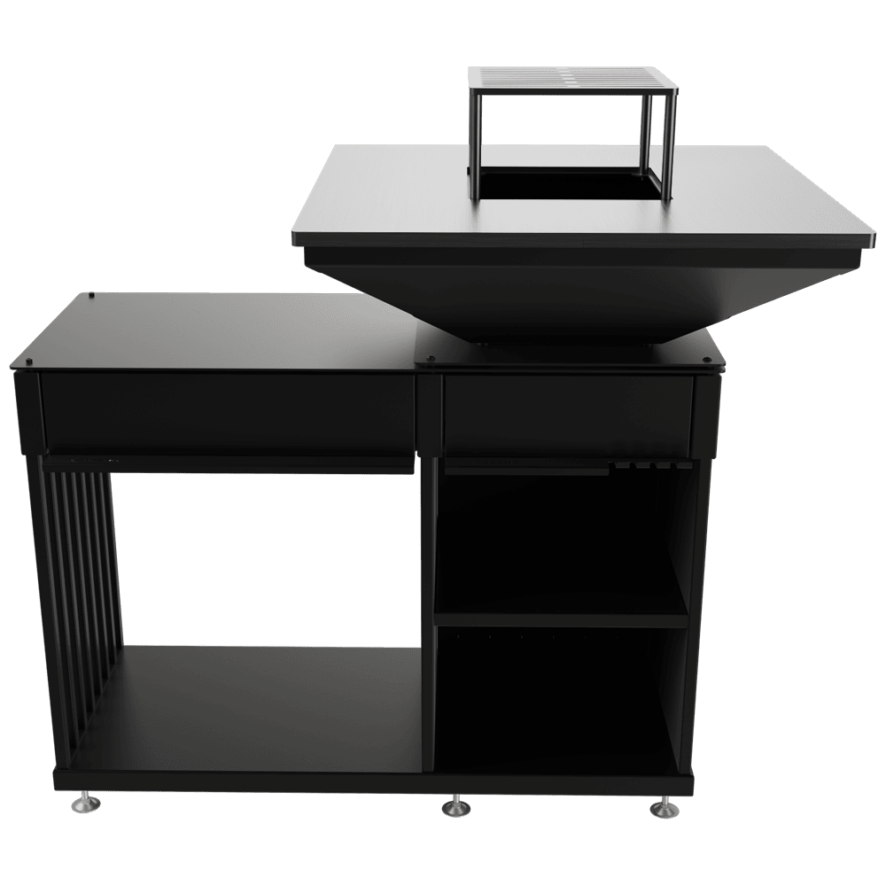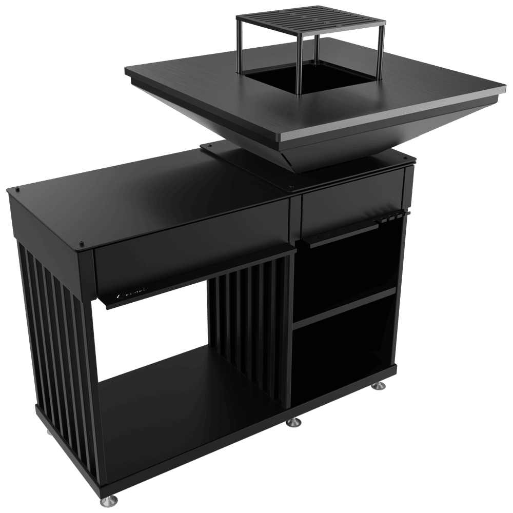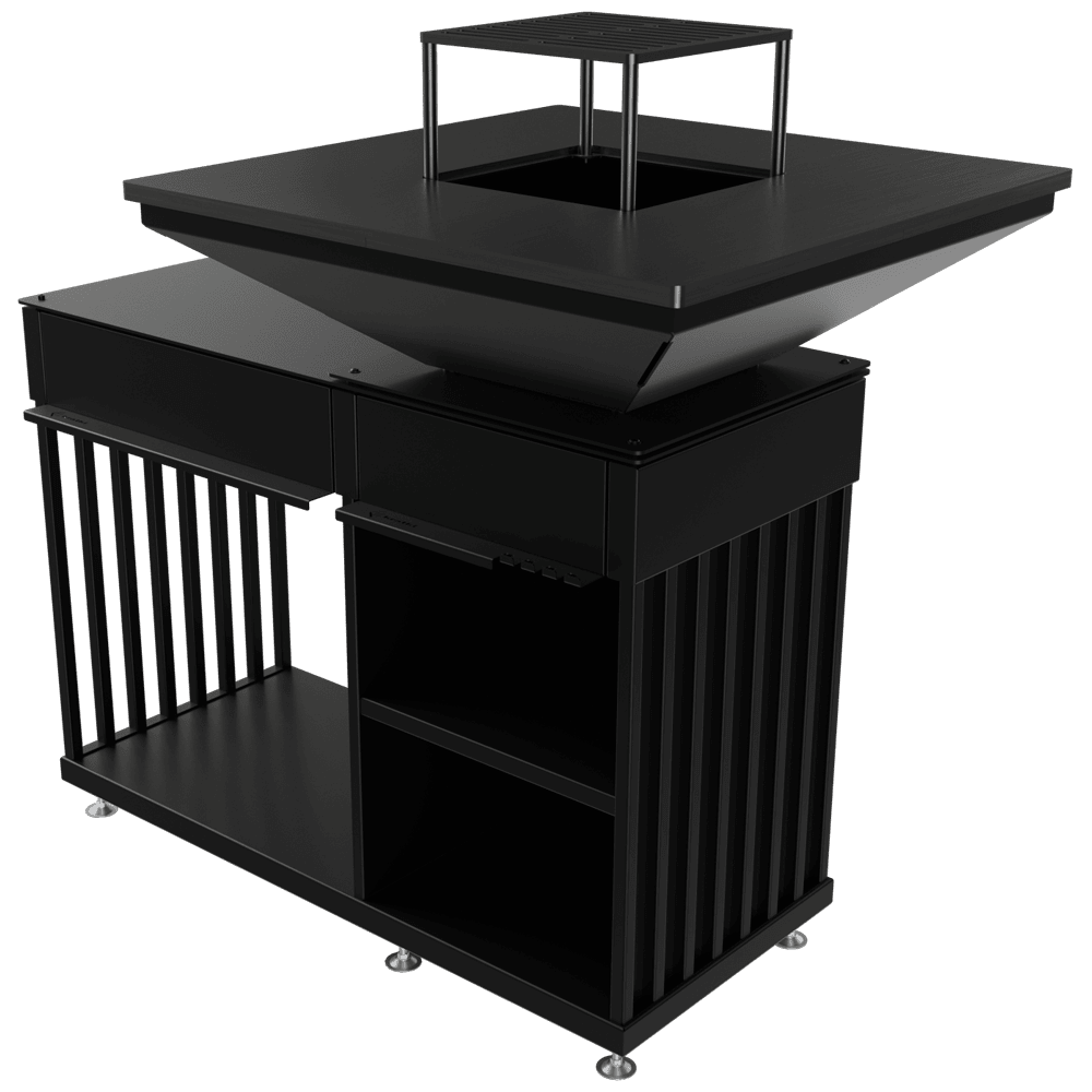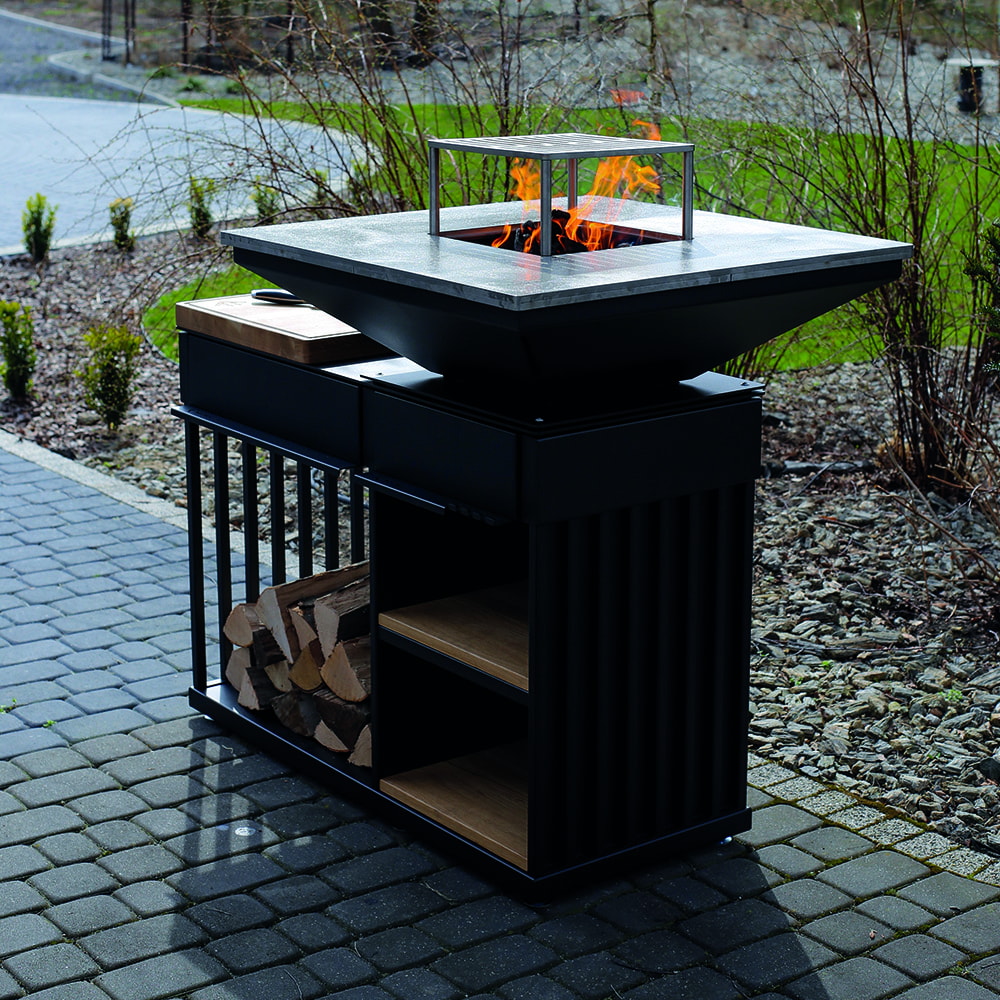 QUADRUM is an excellent quality, professional barbecue fire pit with a wood-burning hearth. It combines everything in one. Equipped with a steel grate, handy storage compartments for utensils and spices with a practical / roomy wood cavity.