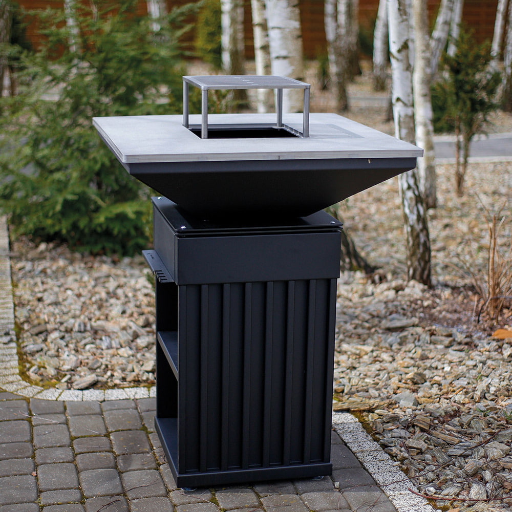 QUADRUM fire pit bbq is not only a modern garden grill, but also a fully equipped outdoor kitchen. It will also be perfect as a garden fire pit with grill - an effective source of heat on cool evenings, as well as a stylish and natural way to illuminate the garden. Comfortable operation Do you remember problems with cleaning the grill? With QUADRUM wood bbq you can forget about it. A specially profiled heating plate allows the dirt to flow down into the hearth. After use, you only need to clean the residue with a spatula and then wipe it off with a damp cloth. The steel construction is not only eye-catching, but also durable and weather-resistant. It does not require any impregnation, and the barbecue hearth can be used all year round! The new dimension of grilling The fire pit bbq QUADRUM will allow you to prepare excellent dishes in comfortable conditions. Equipped with a steel grate that enables traditional grilling. The plate around the wood stove allows not only grilling, but also cooking, frying, heating. It prevents food from burning and drying out. Food does not come into direct contact with smoke or fire. Preparing food on a grill fired with natural hardwood guarantees that the dishes are healthy and have a unique aroma. QUADRUM is not only an exclusive grill on which you can prepare healthy meals. It is an original space decoration that will give it a distinctive character. It is a way of spending time that guarantees that moments with your loved ones will become unforgettable.