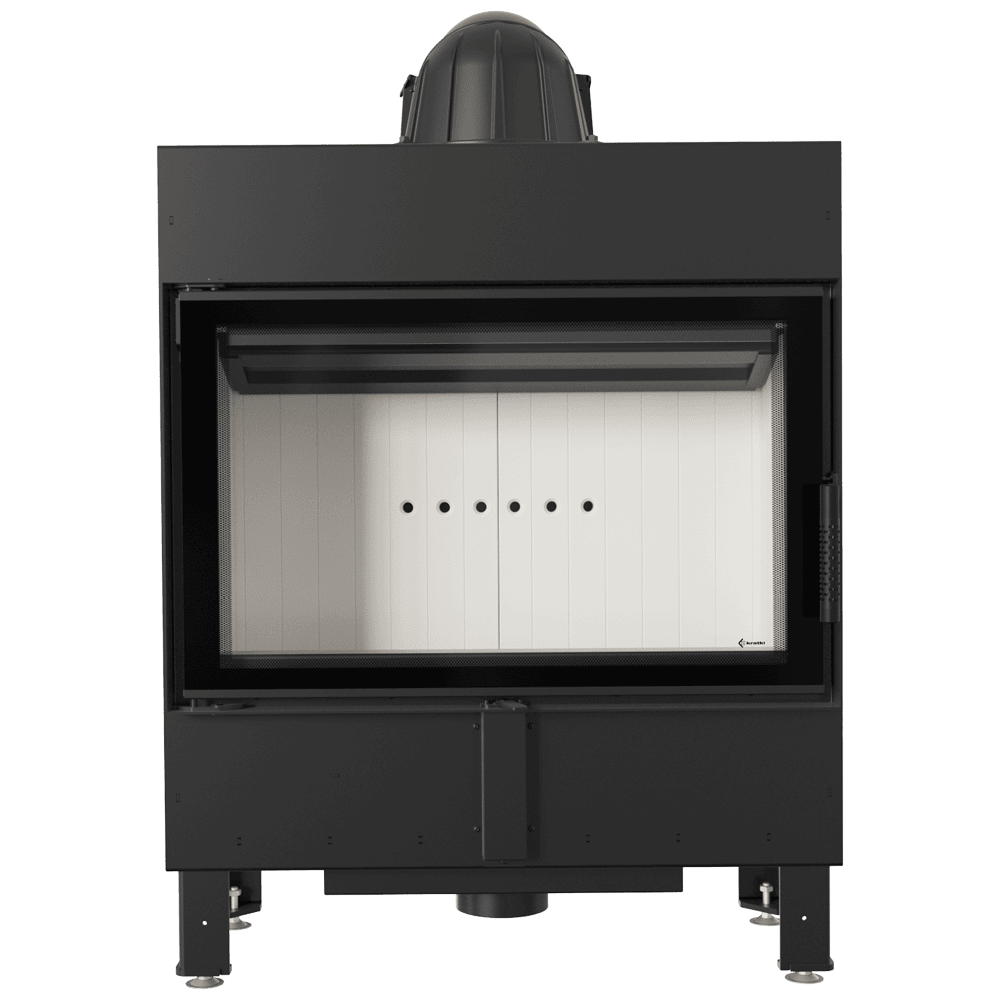 COMFORTABLE USE - Special profiled bottom plate of TERMOTEC is used in this insert. Thank to that the chamber of the fireplace is bigger and larger amount of wood can be put inside. Additionally shallow combustion chamber was used, this results on low demand for heating power. Thanks to this the fireplace perfectly suits to small living spaces. Movable grate and ash drawer enable to keep the insert clean. Reduced soot deposition through a system of clean glass system (air curtain). Air curtain separates the glass from the chamber thanks of that the glass doesn’t become dirty and emit more heat to the room. Insert can be easily elevate thanks to the regulated the legs. The model is equipped with a movable exhaust outlet and thanks to that there is no need to purchase additional knees for installation. It is possible due to easy adjustment of the angle of connection to the chimney system.