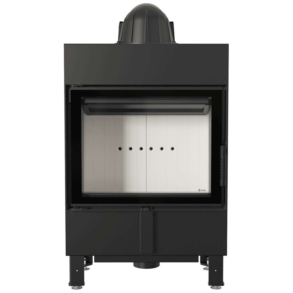 COMFORTABLE USE - Special profiled bottom plate of TERMOTEC is used in this insert. Thank to that the chamber of the fireplace is bigger and larger amount of wood can be put inside. Additionally shallow combustion chamber was used, this results on low demand for heating power. Thanks to this the fireplace perfectly suits to small living spaces. Movable grate and ash drawer enable to keep the insert clean. Reduced soot deposition through a system of clean glass system (air curtain). Air curtain separates the glass from the chamber thanks of that the glass doesn’t become dirty and emit more heat to the room. Insert can be easily elevate thanks to the regulated the legs. The model is equipped with a movable exhaust outlet and thanks to that there is no need to purchase additional knees for installation. It is possible due to easy adjustment of the angle of connection to the chimney system.