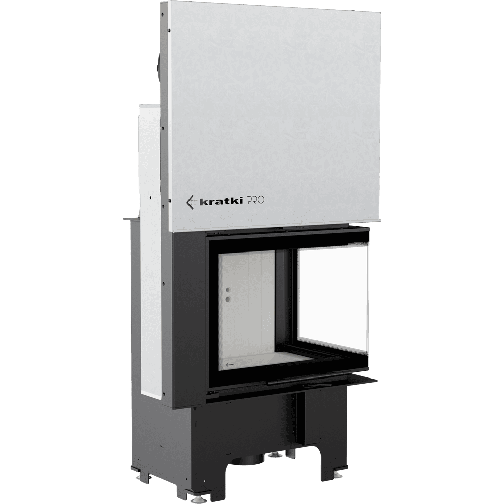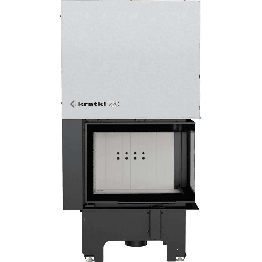 COMFORTABLE USE - The door of the insert works in the lift up system - the window is lifted up. This system was built based on the counterweight - the steel cable pulley works in guides on two ball bearings, thanks to which the weight of the door is distributed evenly. They move on fireproof bearings along the sliding guides mounted in the frame, which guarantees their light, quiet and trouble-free operation. Movement of the door runs a few millimetres away from the body, which prevents damage to the seal. Lockable doors are pressed with great force into the frame, thanks to which the furnace is completely sealed. Thanks to the raised and lowered door, you can load the right amount of wood at a time. An additional mechanism that allows the side windows to be opened, making them easier to clean and to keep the furnace clean. The device is additionally equipped with a clean glass system - thanks to the so-called curtain air flow is distributed evenly, sweeps glass and minimizes the deposition of soot on it. This allows you to maintain the effective and clean look of the glass for a long time. The fireplace has a specially profiled bottom plate made of TERMOTEC, thanks to which the combustion chamber is deeper and contains more wood. Maintaining the fireplace is easier due to the mounted grate and the container in which ash accumulates. The internal revision system makes it possible to carry out service activities from the inside of the furnace without destroying the building of the fireplace. The insert can be used in a variety of mounting conditions, thanks to adjustable feet and a movable adjustable 360° exhaust outlet.