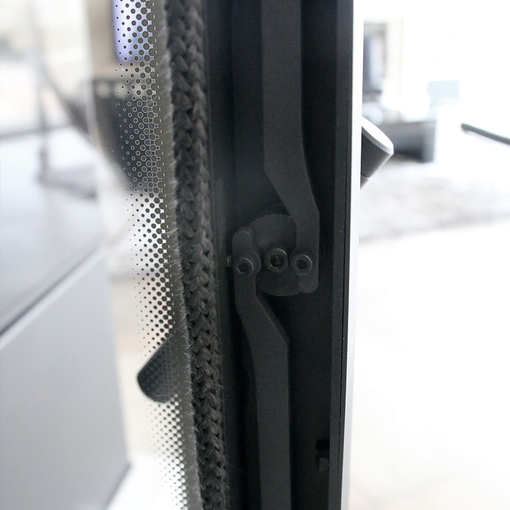 MAXIMUM USE OF ENERGY - More efficient combustion and longer maintenance of temperature by lining the combustion chamber with ceramic material TERMOTEC which accumulates heat and raises the temperature in the furnace. Full combustion on the dust thanks to deflector which extend the exhaust path. This process increases the efficiency of burning and guarantees better energy use. It also minimizes the emission of harmful substances to the atmosphere. Additionaly a diphragm that functions similarly to the deflector has been installed at the exhaust outlet, which further enhances the effects of the device. Primary air is supplied to the insert thanks to the built-in 100 mm external air inlet. Air inlet is located from the bottom of the insert. Insert has a cover plate on the back wall and a hole in its base. Thanks to it the user can choose how to connect the external air kit. Air adjustment is done with a throttle adjustable by one regulator placed below the door. This solution prevents from improper usage. Whole mechanism works quietly and without fail. In this insert there is triple air system of combustion chamber. Primary air which enables setting a fire is supplied under the grate. Secondary air - providing economic and ecological burning is supplied by holes on the back wall. Additionally, this insert is equipped with Clean Glass System (air curtain), so the air is supplied directly to the glass through a system of channels located on the sides of the fireplace. In this way oxygen is supplied to the upper part of the combustion chamber, were happens post-combustion of gases produced while combustion of wood. At the same time it reduces harmful CO emissions to the atmosphere.